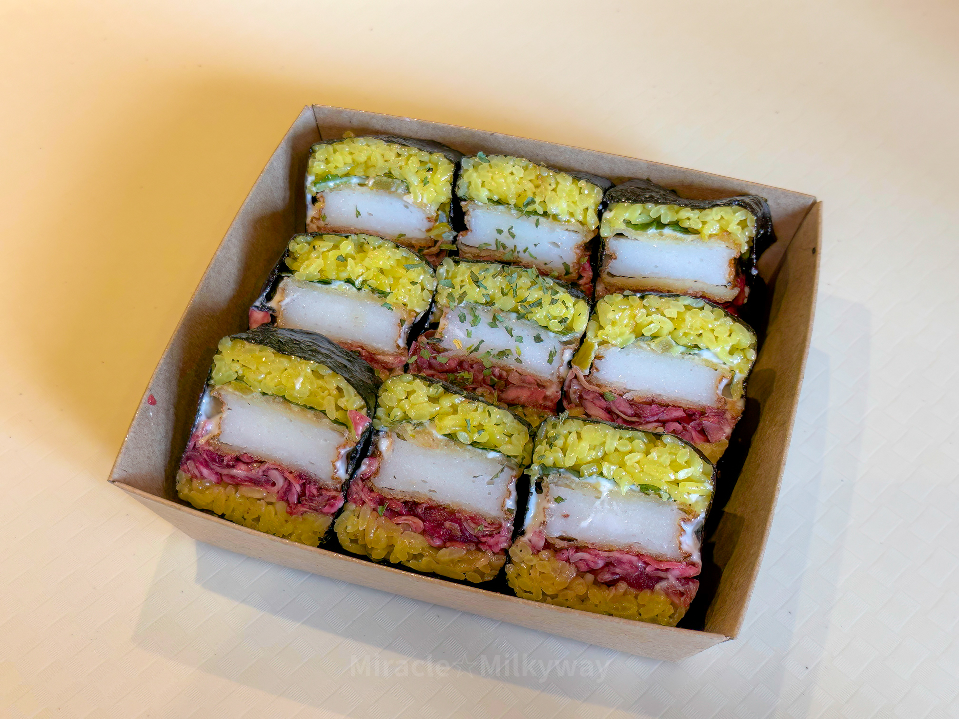 딱새우살을 맛살처럼 만들어서 튀긴 후, 각종 피클 등을 함께 쌌다.