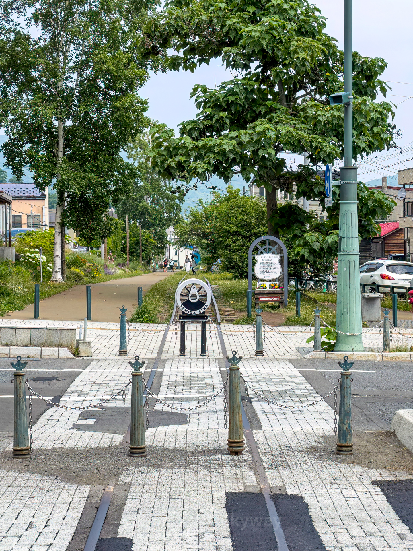 역에서 운하까지 내려가는 길에는 현재 폐선된 테미야선(手宮線)의 흔적이 있다.
