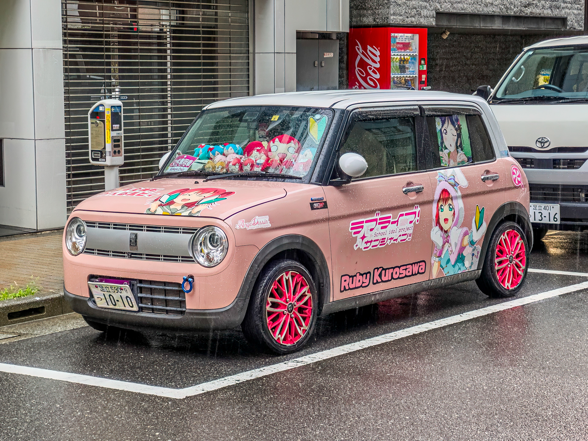 호텔로 걸어가는 길에 차를 캐릭터로 가득 채운 이타샤(痛車)를 발견. 지난 시즈오카 여행에서 자주 본 '러브라이브 선샤인' 시리즈의 '쿠로사와 루비' 캐릭터가 그려져 있었다.