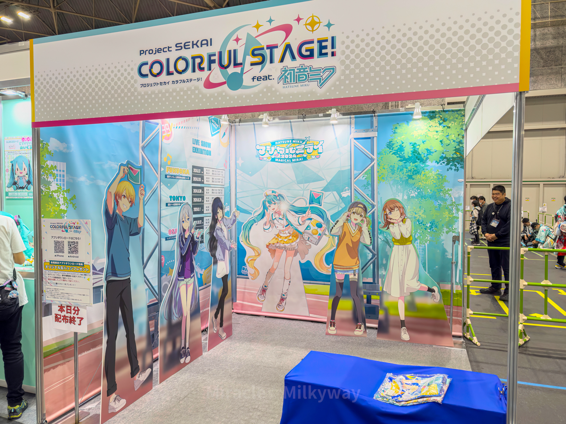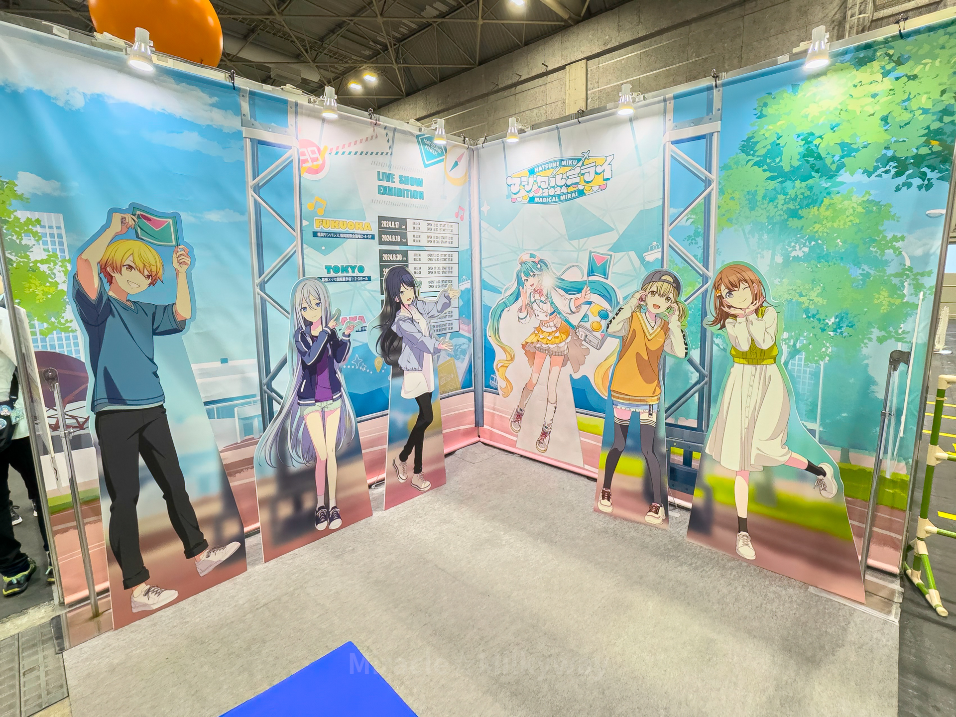 보컬로이드와 여러 캐릭터가 추가된 리듬게임, 약칭 '프로젝트 세카이(プロジェクトセカイ)'의 부스도 보인다.