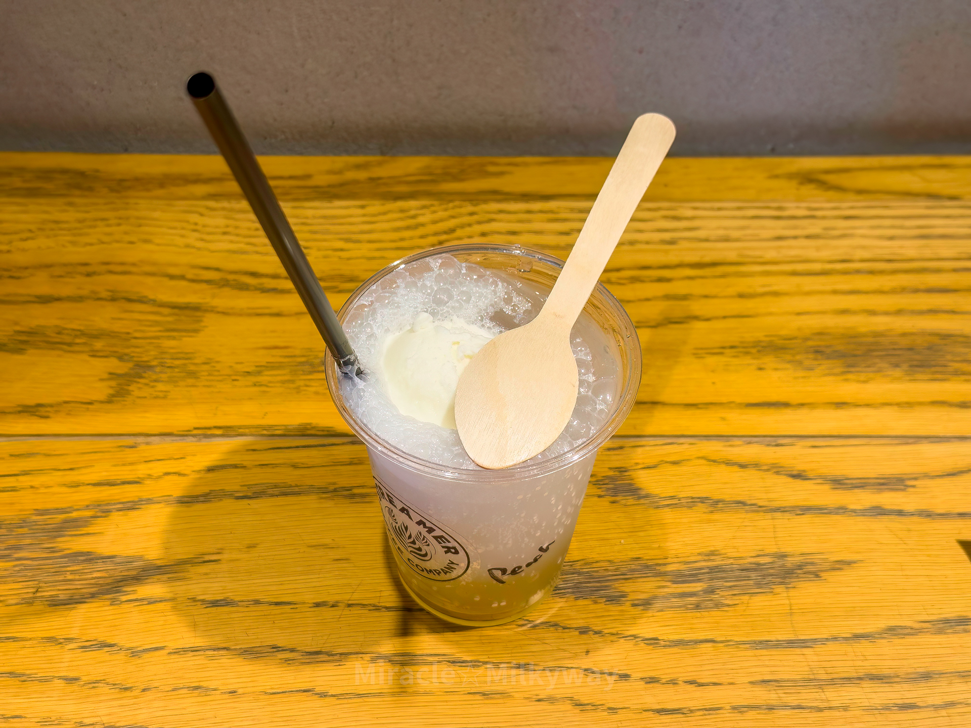 서양 배 같은 맛이 강하게 탄산을 타고 올라오는 듯한 맛이었다. 위에는 물의 비율이 좀 많은 바닐라 아이스크림이 떠 있었다.