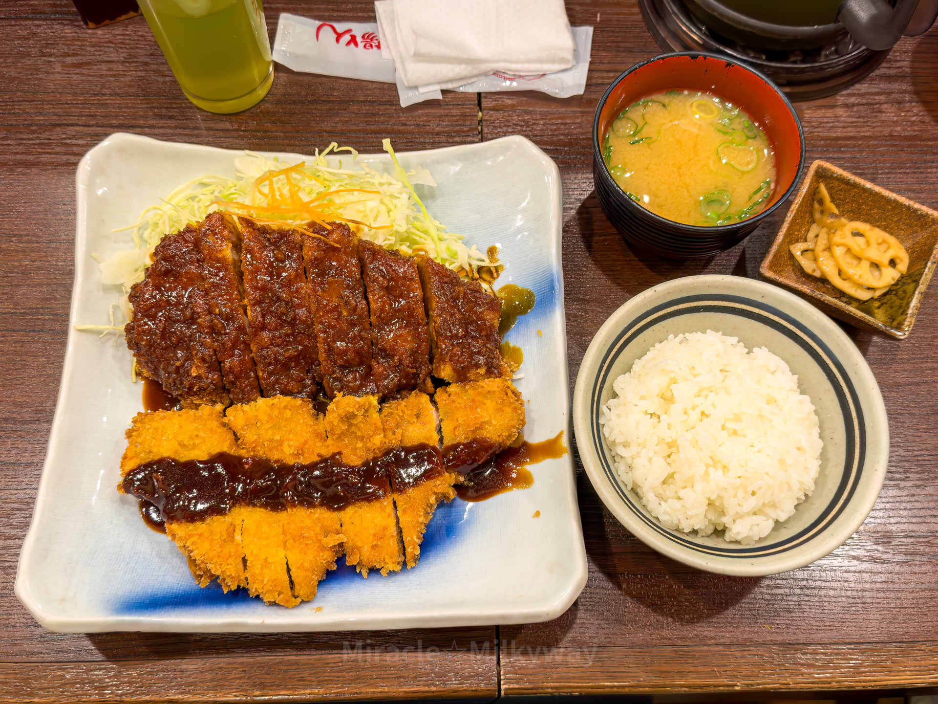 미소카츠 소스와 일반 소스를 동시에 먹을 수 있는 메뉴가 있어서 그걸로 선택. 위의 진한 색이 미소카츠로 덮힌 조각이다. 된장 향이 그렇게 진하지 않고 무난하게 맛있었다.
