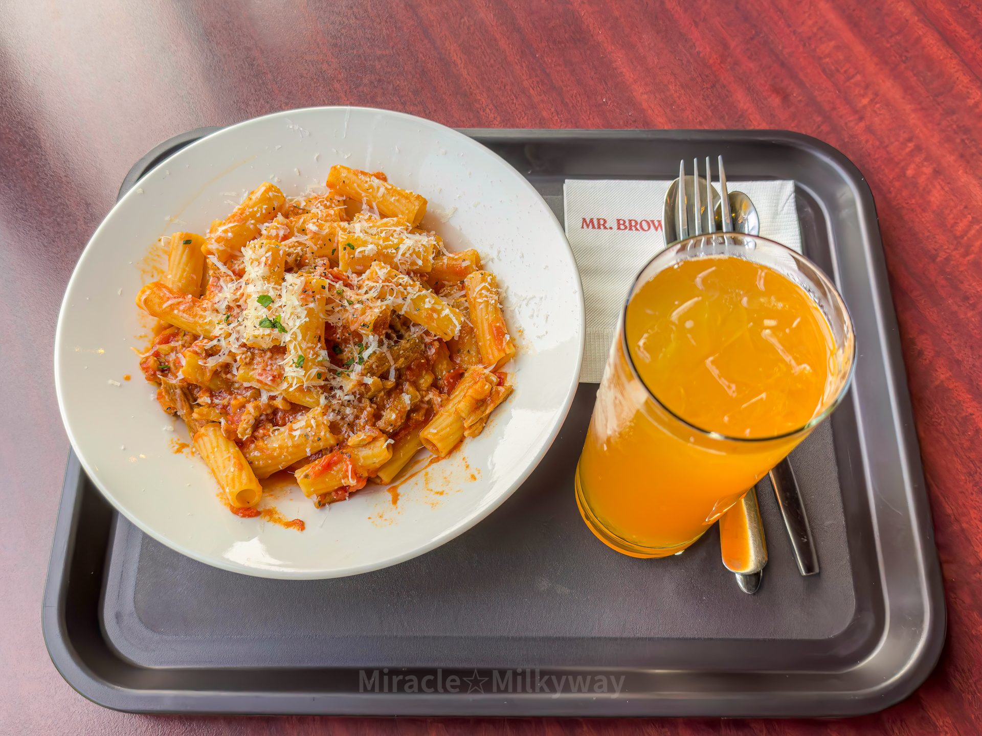 2층의 카페 '미스터 브라운'에서 주문한 미트 토마토 파스타와 자몽허니블랙티 비스무리한 음료