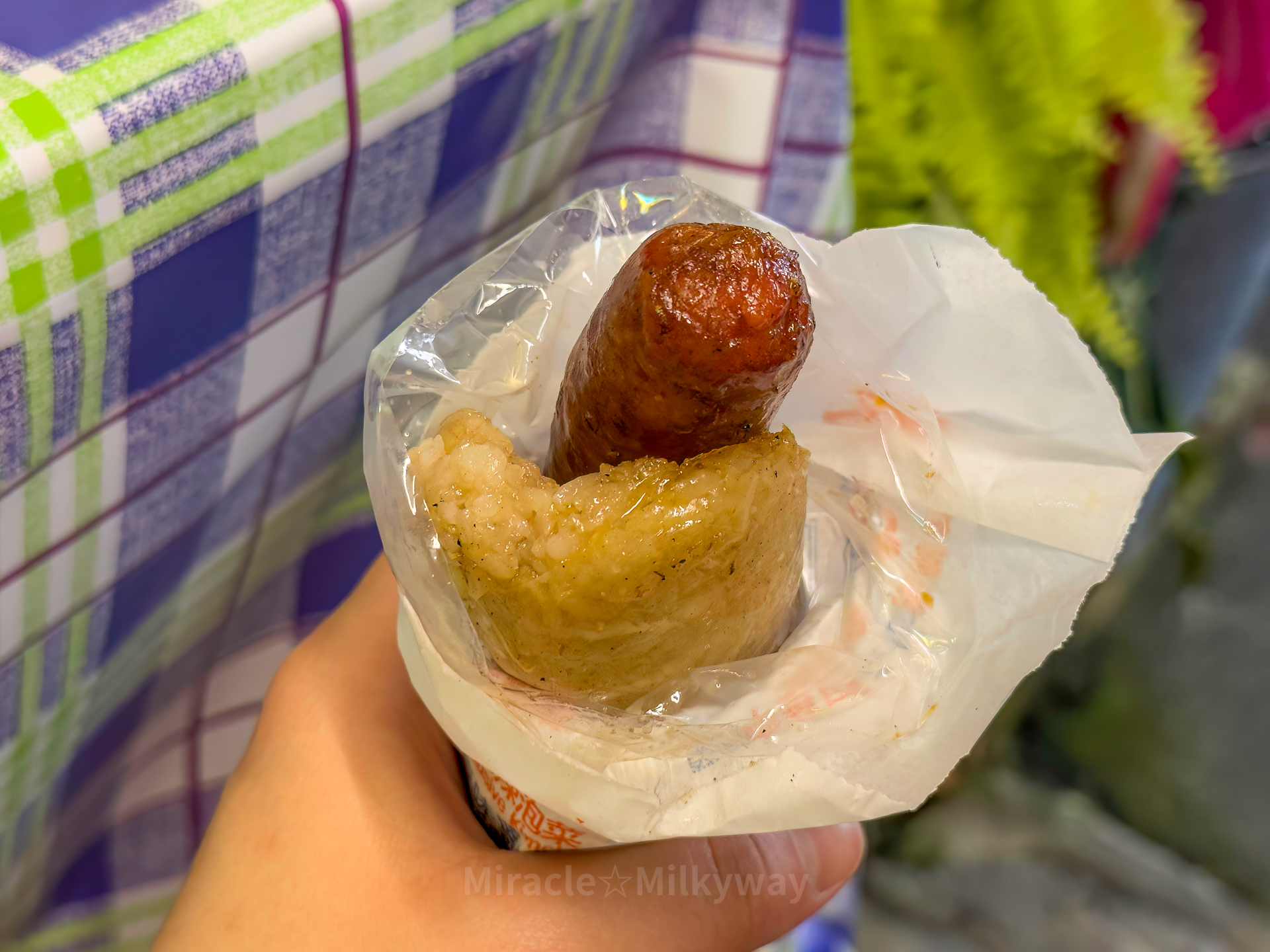 역시 시장 음식으로 가장 무난한, 소시지 둘레에 쌀풀과 같은 떡을 붙여주는 샹창을 2개 샀다.