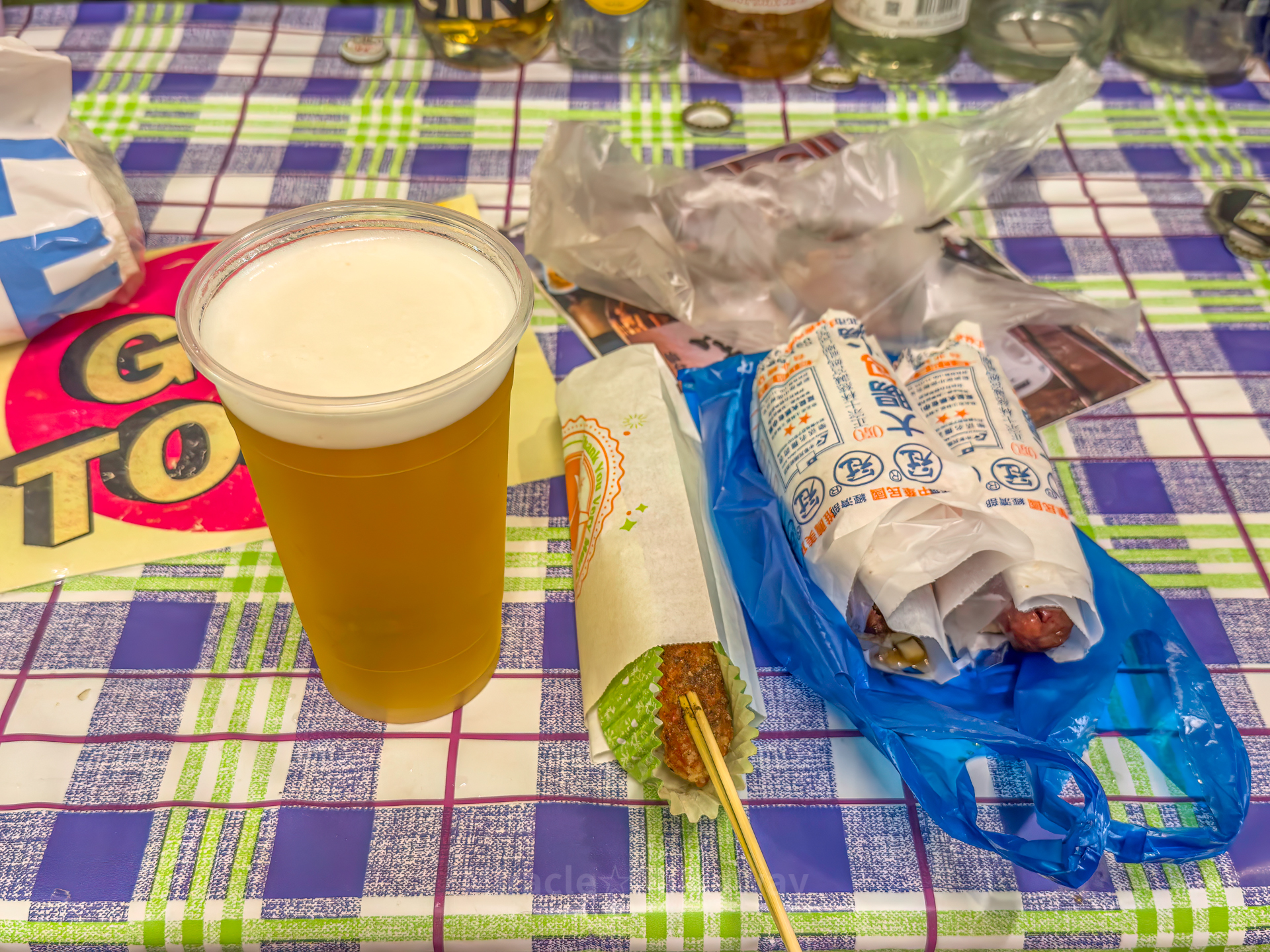 그리고 여러 음식들을 더 사서 어디서 먹어야 할까 두리번 거리던 중, 대만의 '18일 맥주'를 생으로 파는 가게(取締役)가 있어서 바로 야외 자리에 앉았다.